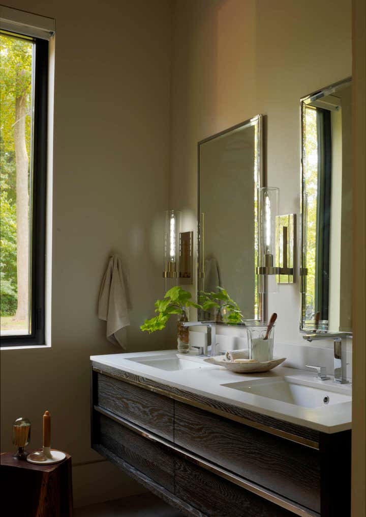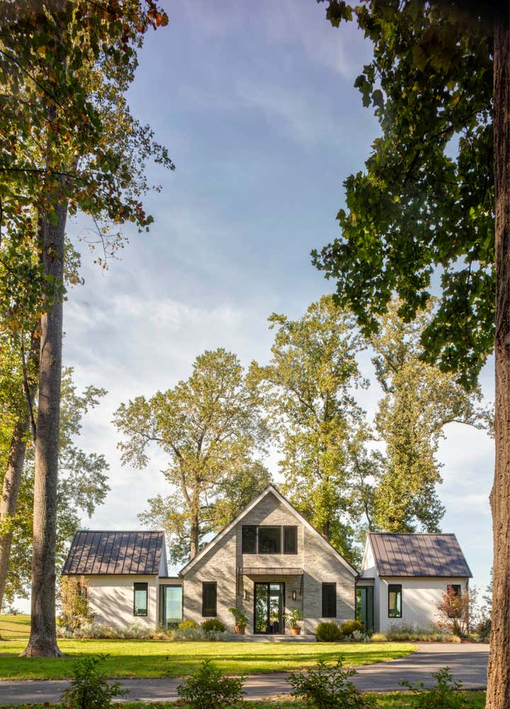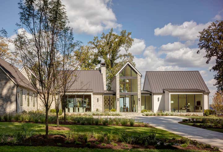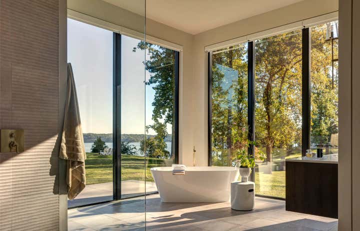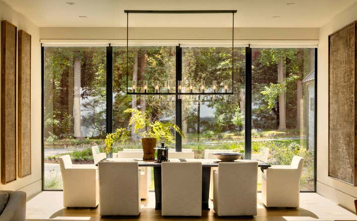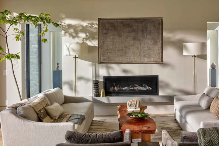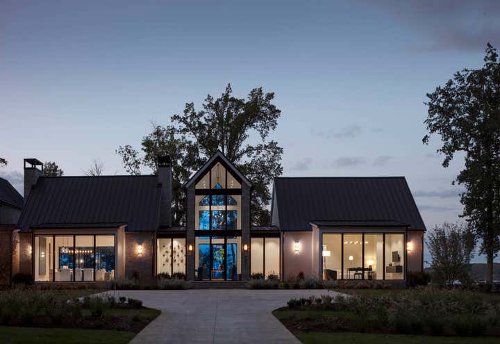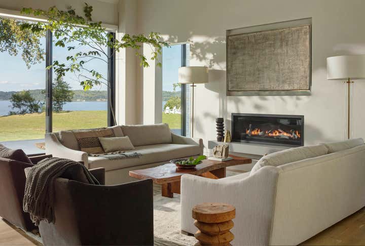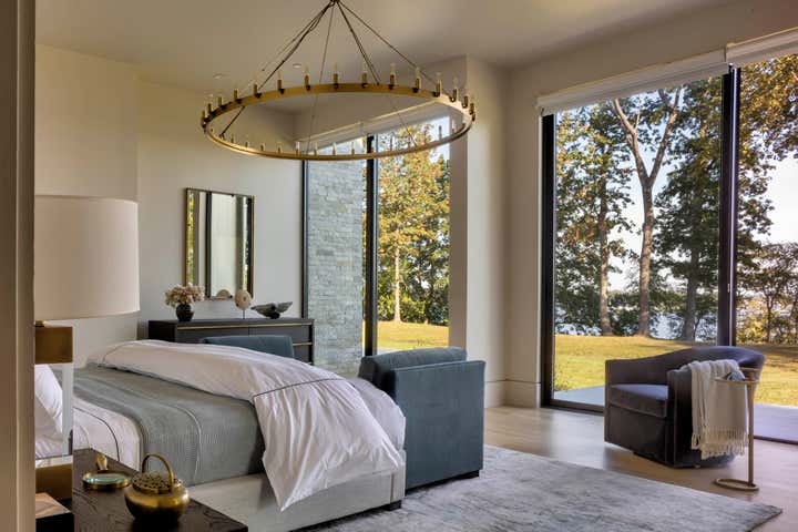 This modern waterfront residence utilizes architecture as a backdrop for an artwork collection that tells the story of years of extensive travel. Specifically, the entry was designed to function as an art gallery, while also capturing immediate views of the water via floor-to-ceiling windows. The floorplan is as practical as it is beautiful, offering one-floor living with the exception of a second-floor office, and placing the master suite and guest suites on opposite wings. A nearby guest house echoes the contemporary design aesthetic, offering three suites connected by glass links.