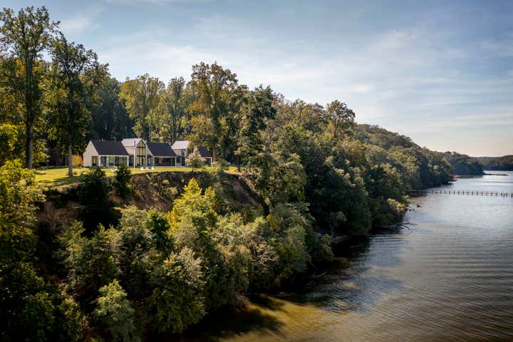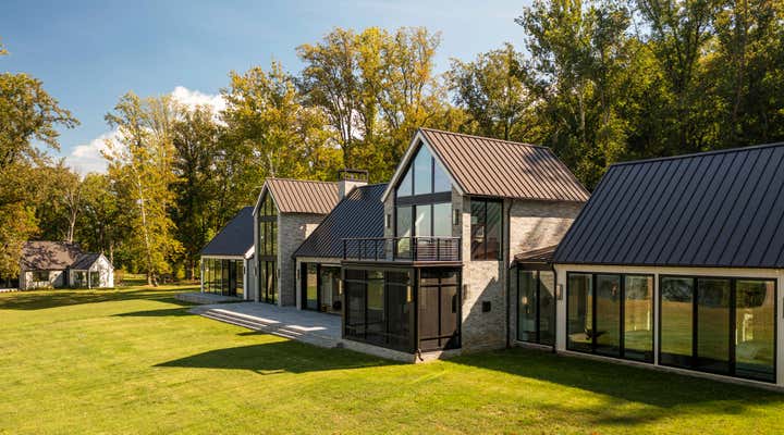 Perched on the edge of a waterfront cliff, a guest house echoes the contemporary design aesthetic of the property’s main residence. Each pod contains a guest suite that is connected to the main living space via a glass link, and a third suite is located on the second floor.