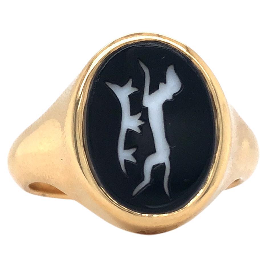 A vintage 14k gold signet ring, features a carved stone Sagittarius design.