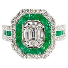 A captivating display of color and brilliance, this 18K white gold ring is centered by a striking emerald-cut diamond, framed by a vivid halo of richly saturated green emeralds. Surr...