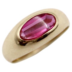 What we love about this 14k gold retro ring is its streamline form: the oval synthetic ruby has a