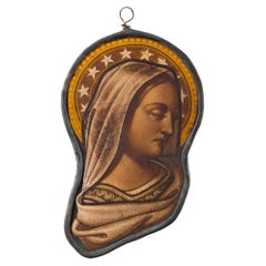 A small antique painted and stained glass window hanging of an ecclesiastical veiled figure with