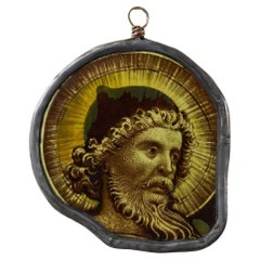 Antique Ecclesiastical Painted Glass Window Hanging of a Saint