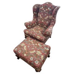 Vintage Wing Chair and Ottoman in William Morris Strawberry Thief Cotton Fabric