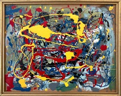 This painting is a vibrant abstract expressionist work in the style of Jackson Pollock, characterized by energetic, chaotic splatters, drips, and interwoven lines of paint. With bold...