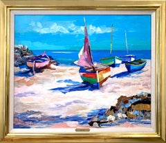 A masterful oil painting depicting a bright Beach scene with boats in the sand. This scene bursts with color; turquoise and combat blue set the view of the ocean and sky, as the boat...