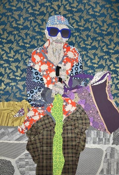 shipped in roll Acrylic painting of woman in sunglasses white dress black dots green socks sitting near shopping cart full of fruits Acrylic Painting on canvas One of a kind artwor...