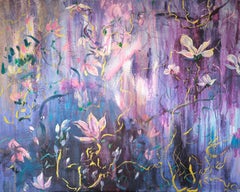 Title: Bluebell Abundance Large Floral Painting, Contemporary, Delight, Colorful, New It captures the essence of nature's delight. Lilies in shades of pink, intertwined Bluebells a...