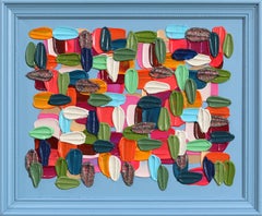 In the 24 x 18in abstract painting Coral Reef, 2025 a. muse uses acrylic, oil pastel, gouache, sand, and diamond dust to render colorful biomorphic forms from the sea. Warm, cool, an...