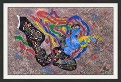 This painting is a vibrant abstract expressionist work in the style of Jackson Pollock, characterized by energetic, chaotic splatters, drips, and interwoven lines of paint. With bold...
