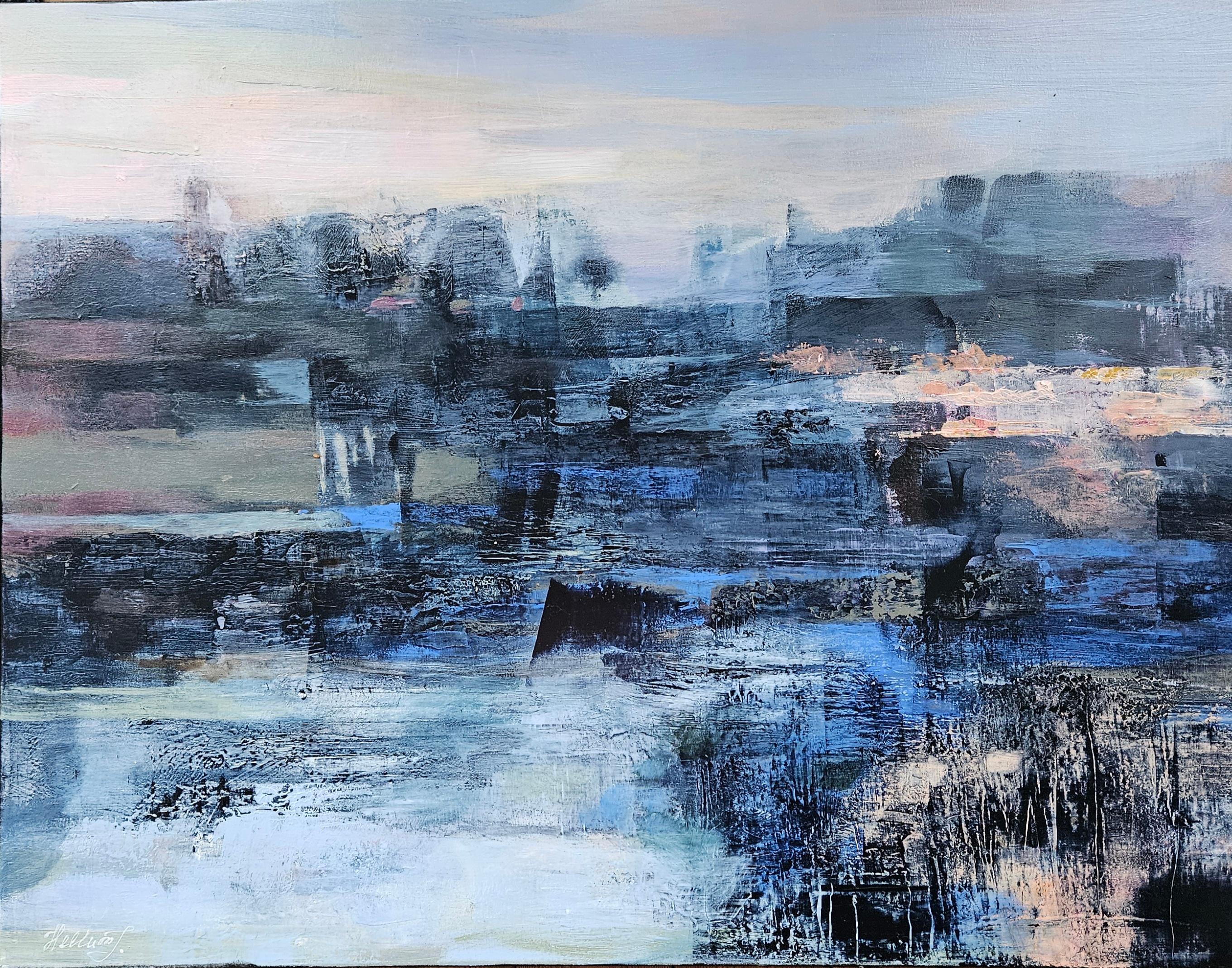 Shades of blue, green, and white suggest a peaceful landscape. The painting reflects the quiet, expansive spaces in nature that always draw artist Kajal Zaveri....