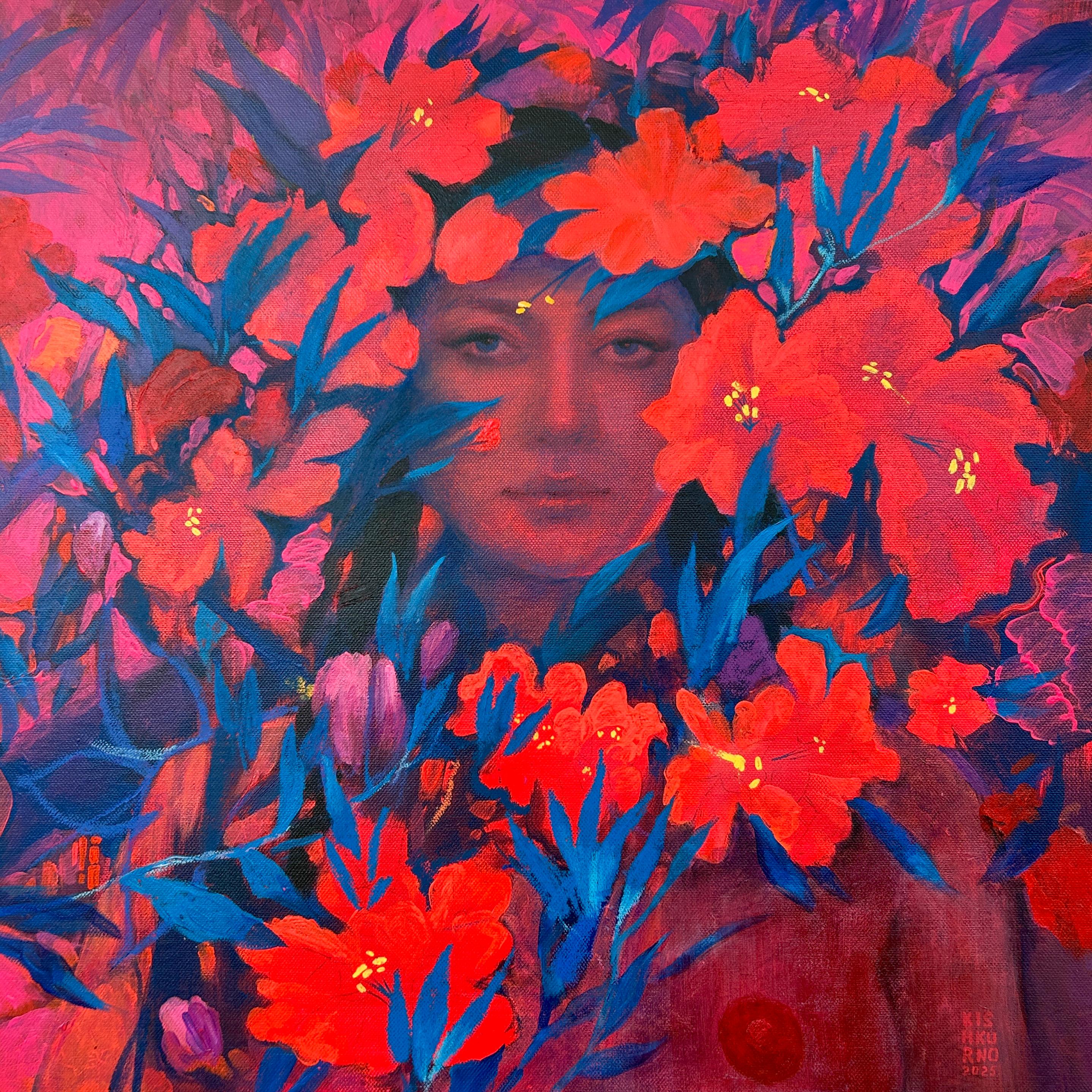 Artist Guigen Zha presents a stylized portrait of a woman’s head, adorned with floral and tree-like elements against a backdrop of blue sky, moon, and seascap...