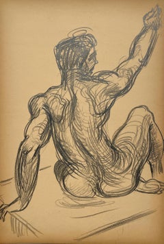 Academic life drawing of male nude with graphite and conte crayon by Mark Beard graphite, Conte crayon on Arches paper 30 x 22.5 inches 33 x 25 inches custom framed in cherry wood m...