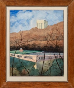 Bell Tower and Buildings In Blue Sky Landscape British Modernist Pastel Sketch