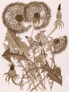 In this contemporary botanical cyanotype painting in watercolor, gouache, India ink, gold pigments and tea-toned cyanotype on cotton watercolor paper, meticulously detailed flowers a...