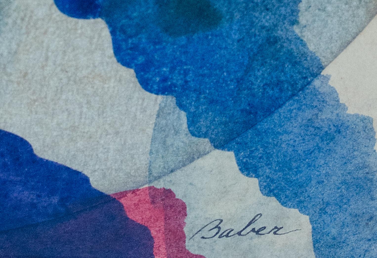 Baber constructed her compositions very carefully. To achieve her luminous effects, she applied transparent layers of diluted oil or acrylic paint to her primed canvases. Baber liked to apply the paint with linen rags wrapped around her hand or finger to achieve her desired intensity of color. Sometimes she used a turpentine-soaked rag to ‘lift’ areas of color and change the opacity of the shapes.