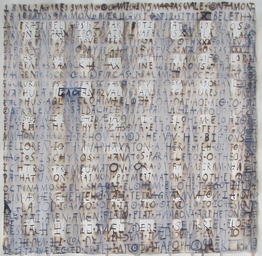 The ink on paper drawings featured here play on the talismanic power of language and the written word. Neither the provenance nor the purpose of the magical processes intimated by the drawings is stated: they could be at once apotropaic charms, the means of commanding supernatural forces or a baroque red herring.