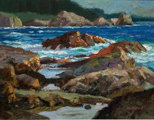 Edward Glafke was born in Portland, Oregon and later moved with his family to San Francisco, California. He attended high school in San Francisco, then enlisted in the Coast Guard for the duration of WW2. He later lived in San Rafael and worked as a commercial artist. As his reputation as a fine artist grew, he eventually settled in Carmel where he established a solid reputation as an impressionist painter and teacher whose students included the noted trompe l’oeil artist, Brent Overby. Glafke worked in both watercolor and oil and his subjects included landscapes, seascapes and still life. He exhibited with success from the 1970's to the 1990's and was, for many years, represented by George Goff's Cottage Gallery on the corner of 6th and Mission in downtown Carmel.
