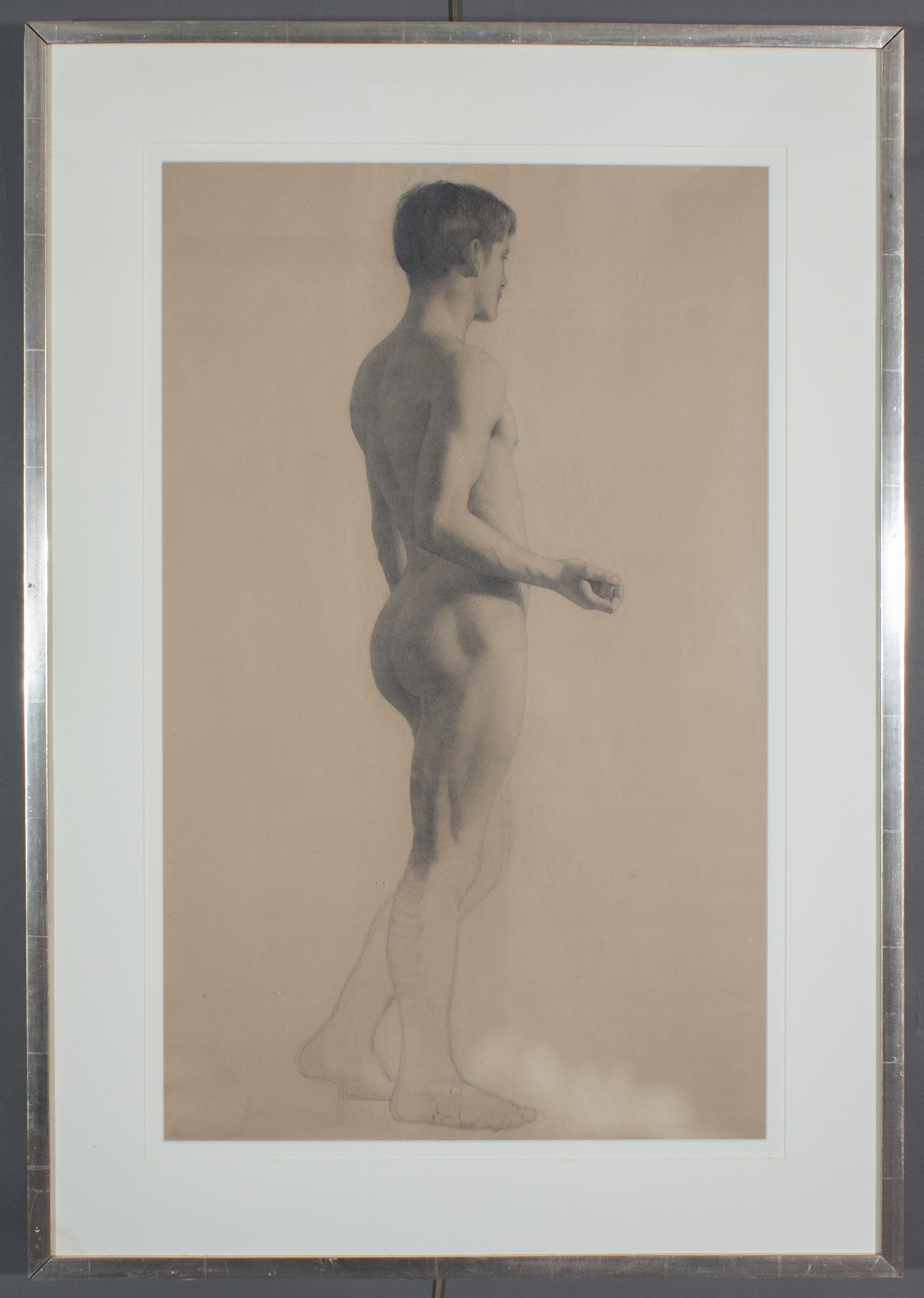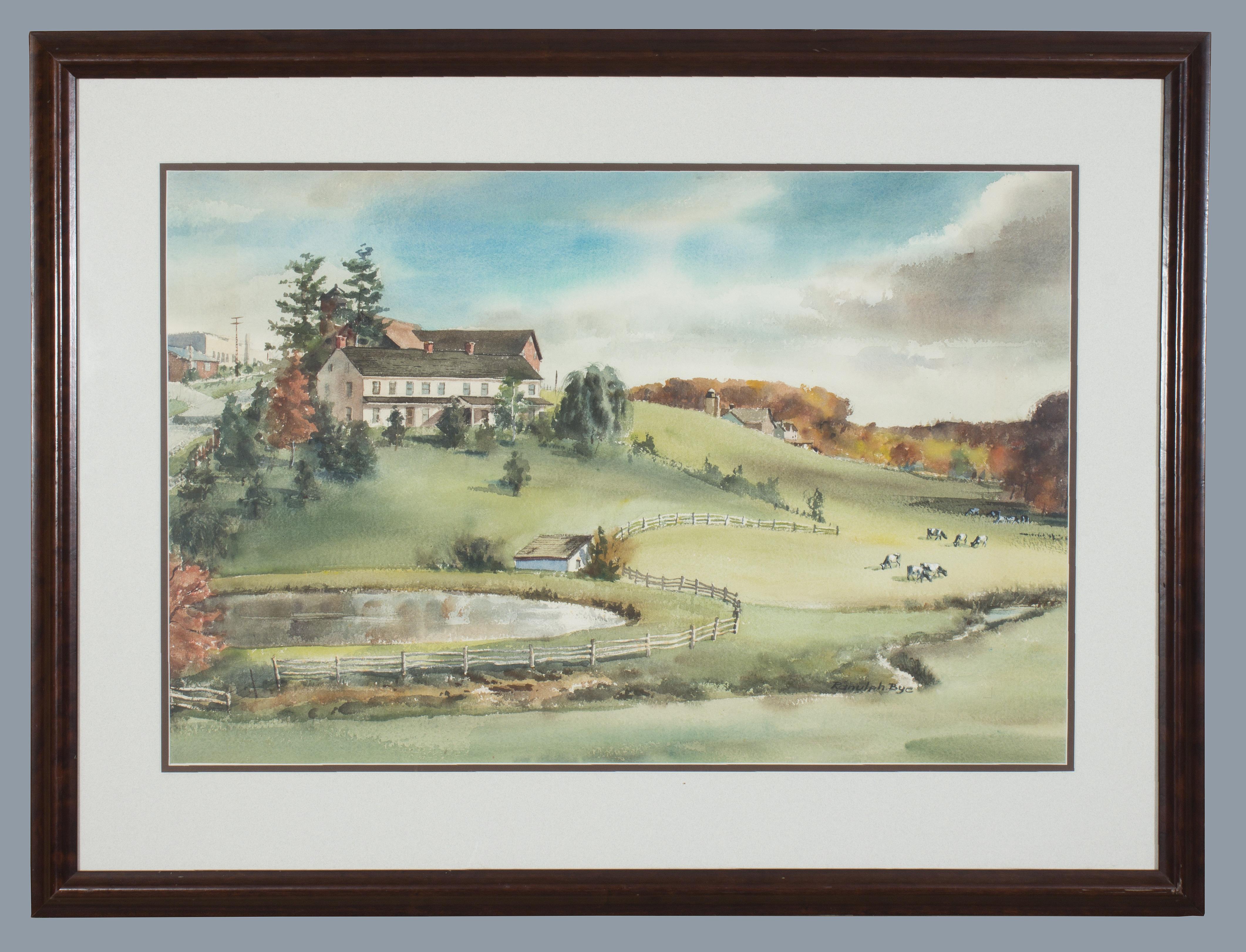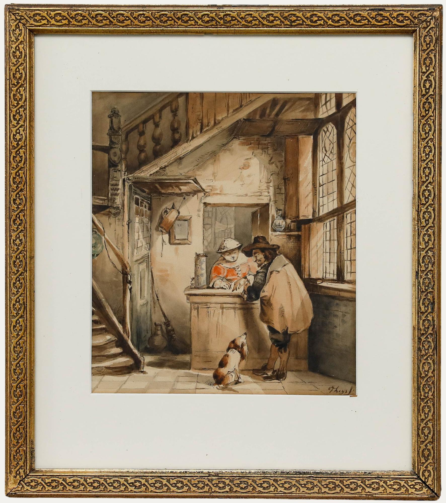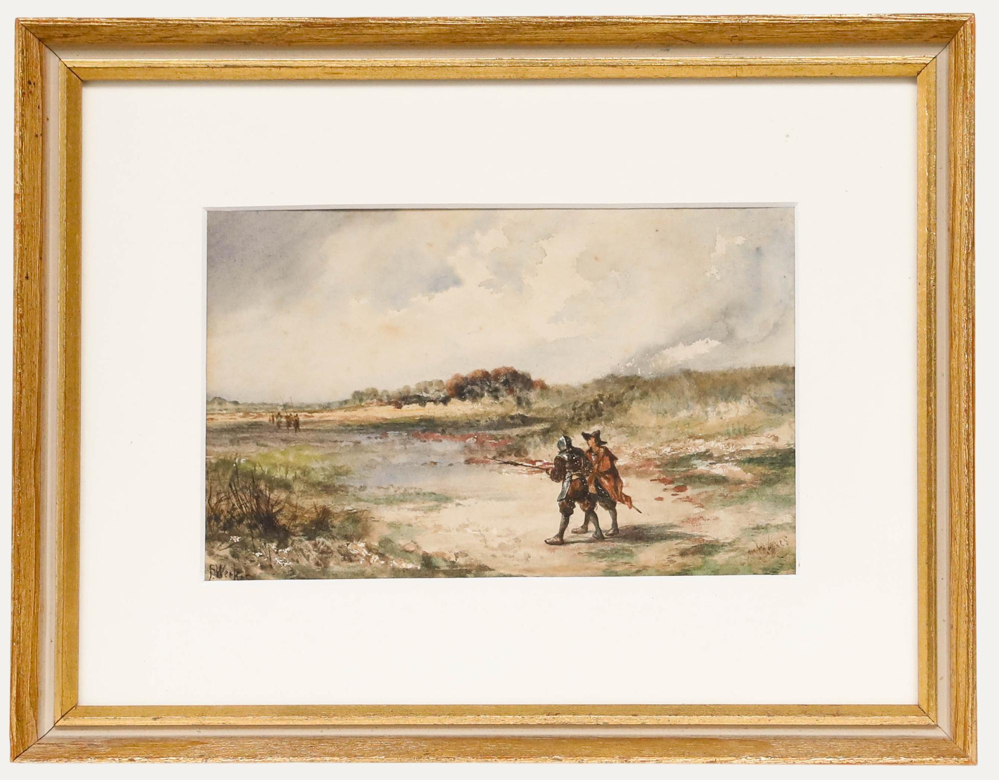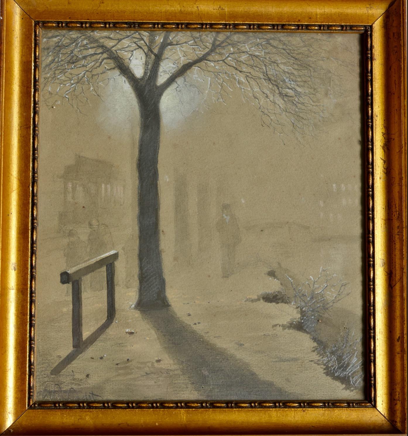 The painting combines naturalism with the wash method of watercolour painting and a reduced palette which allows for a rich harmony of shadow and light. Although appearing to simply utilize monotone colours, closer inspection reveals splashes of quite vivid colours; the yellow on the horizon, a deep crimson on the trousers of one of the figures, blue in the nets etc. The colour is subtle but adds a richness to the overall composition implying that this artist has received an academic training; knowing how to get the most from the materials.