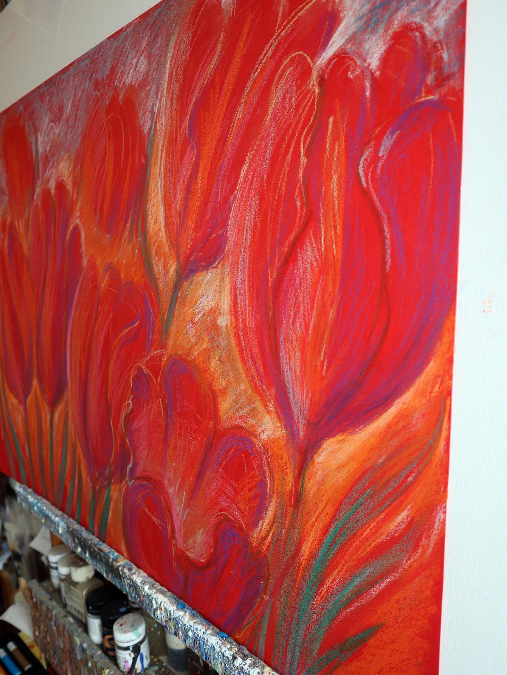 "Tulips Red 4" is a vibrant floral painting where passion meets bold expression. Red takes center stage, brought to life through expressive strokes of oil stick on paper. The artist'...