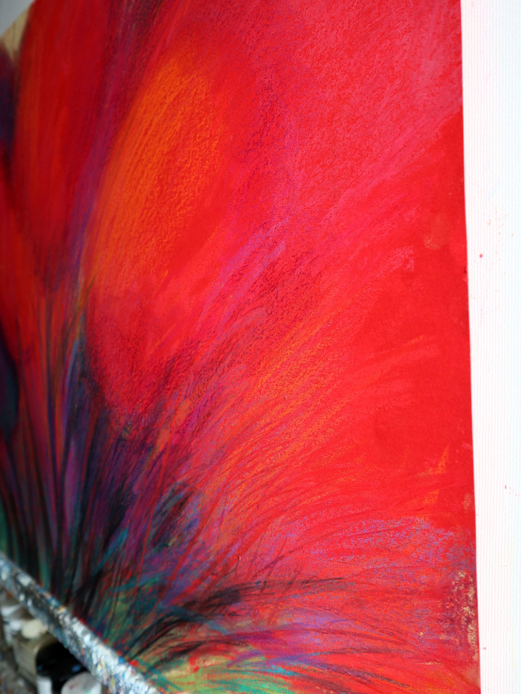 With bold strokes of acrylic, vibrant oil pastels, and lively colored pencils, I poured my heart into this piece. The red tulips pulse with energy and passion, blending expressionism...