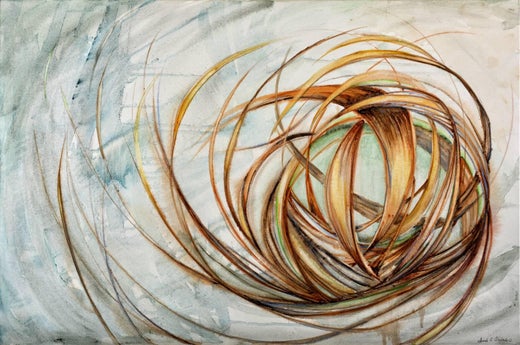 In "Flutter", a 24 x 36 x 1.5 inch mixed media painting on canvas, Sarah Alexander continues to explore the grassy seedpods she has studied in previous work, but has begun to abstra...