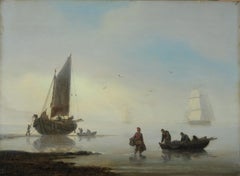 Early English Romantic Oil Painting Farmers with Horse & Cart crossing Stream