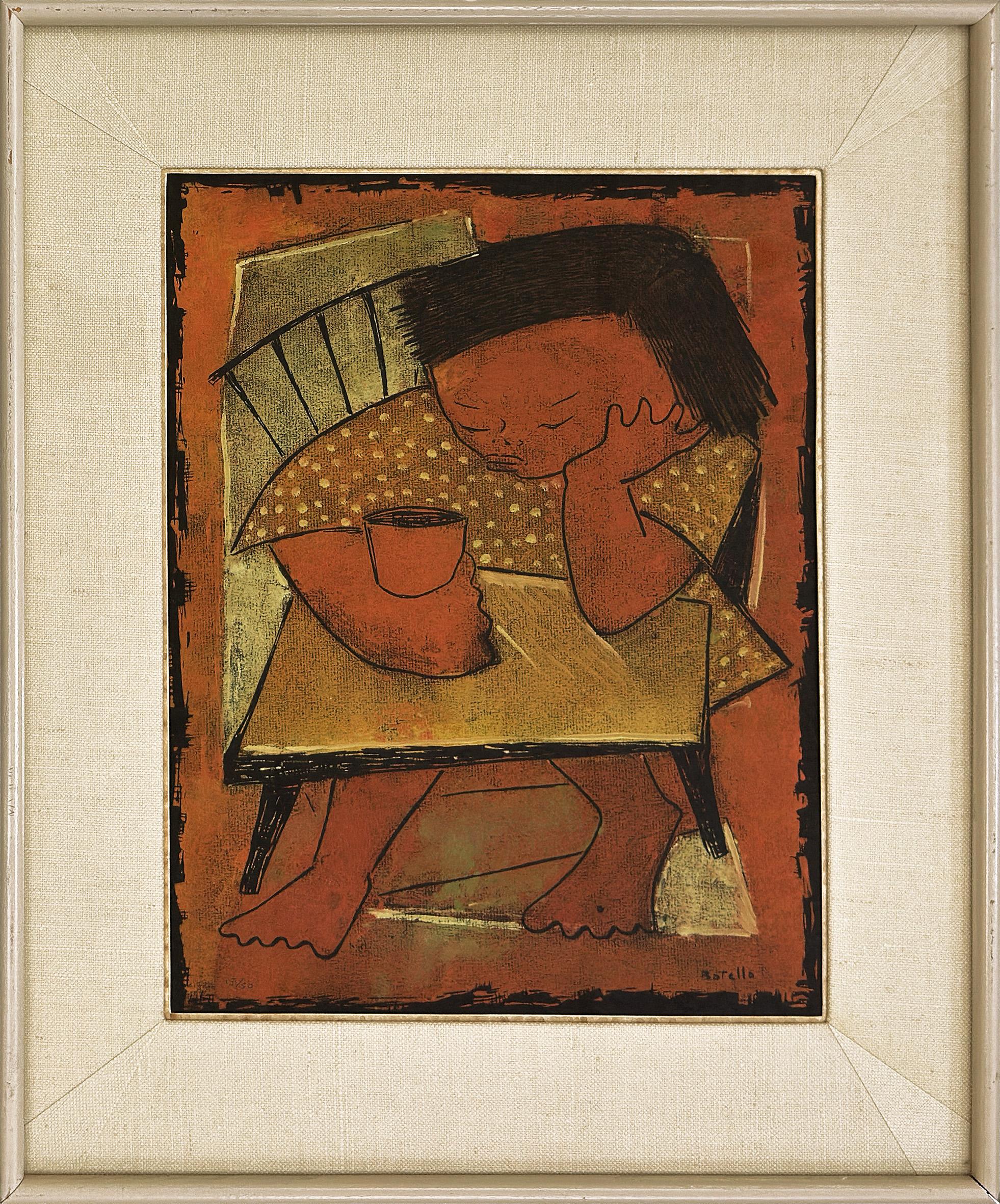 charming antique oil painting on wood board unsigned but attributed to the artist, Adolphe Deteix (1892-1967) see label on back, part of a private collection. Three women sit aroun...