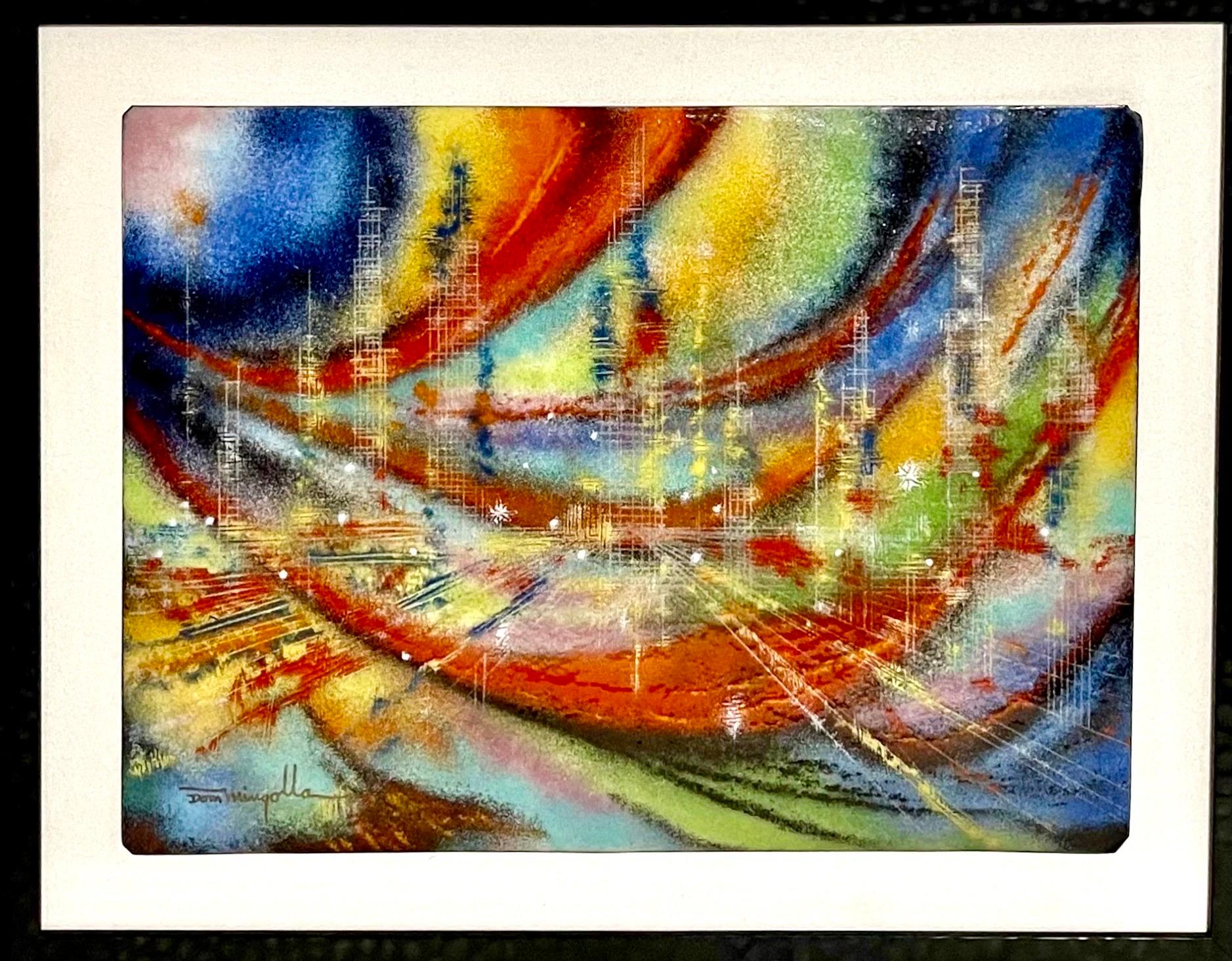 Signed lower left, 'R. Bowman' for Richard Irving Bowman (American, 1918-2001), titled, 'Kg. 55' (Kinetogenics 55) and dated February 1962. Additionally titled, on stretcher bar verso, 'Kg 55'. Accompanied by a first edition copy of 'Richard Bowman: Radiant Abstractions', by Patricia Watts and Stefanie De Winter, published 2018. Richard Bowman's work is featured in the July/August 2024 issue of Architectural Digest, in an article titled, 'Inside a 1920s LA Respite, Re-envisioned by Jamie Bush. Richard Bowman was awarded a scholarship to study at the Art Institute of Chicago and received his Bachelor's degree in 1942. He subsequently attended the University of Iowa, receiving his Master's degree in 1945. Over the course of a long and distinguished career, Bowman exhibited internationally with success and was the recipient of numerous gold medals, prizes and juried awards. With the Kinetogenics Series, which he began in 1956, Bowman explored the intersection of color and light using contemporary advances in light theory and fluorescence technology. "For this series, he started using fluorescent enamel alkyd paint, which, Bowman stated, emitted an actual, measurable energy from the canvas. He combines his early concept of elemental radiants with the gestures of a mature Abstract Expressionist. Incorporating bold fluorescent strokes of orange, yellow and blue, which are activated by the ultraviolet in daylight, Bowman's new abstractions represented a synthesis of the physical and sensorial transmissions of energy. The combination of the artist's interests in nuclear physics, atoms, and dynamism with these vibrant colors reflected Bowman's increasing confidence as an unconventional artist working in an unconventional medium." (Richard Bowman: Radiant Abstractions, p. 13) "The 'kinetogenic' series which Bowman has been painting recently, are whorls of pure energy in colors from the violet edges of the spectrum in vibrant relationship to the vivid primaries of the center. These paintings have much less sense of place or landscape than Bowman paintings we have seen before. The “Environs” group accompanying the energy pictures in this exhibition, are, on the other hand, specific about place: are of flower beds and branches of trees, painted with the same brilliant color intensity. This use of vibrant colors gives an all-over electric, textural effect in contrast to the after-image jump which obtains when the vibrants are painted flat and geometric. This textural mosaic effect is close to the vision of heat and passionate rhythm which was central to pre-Columbian art, and is still present in the Mexican arts and crafts, which were one of Bowman’s formative sources. It is interesting to note that several of the painters who have influenced many others to experiment with vibrancy and glow in color, found their own impetus in this direction while painting in Mexico. Bowman was one of the painters who was working with fluorescents when the general tendency was to paint with muck. One feels that using color thus leads the artist, as it did his pre-Columbian esthetic ancestors, in the direction where the ecstatic becomes mystic." (courtesy: Artforum, April 1964) Thomas Albright writes of the artist, "Visiting Mexico on a traveling fellowship in the early 1940s, [Bowman] met Gordon Onslow-Ford, with whom he renewed a friendship after moving to San Mateo County in the early 1950s. His paintings, although gestural and abstract, were close in spirit to those of the Dynaton artists than to the mainstream of Abstract Expressionism. They constituted an intensely lyrical and metaphorical abstract Impressionism inspired by Bonnard and an intimacy with the natural environment. Bowman was also influenced by jazz improvisation and the jazz poetry of Kenneth Patchen, a close friend" (p. 263) EDUCATION Art Institute of Chicago, BFA, 1944 University of Iowa, MFA, 1949 AWARDS 1942 Edward L. Ryerson Foreign Traveling Fellowship, Art Institute of Chicago (Mexico) 1945 William M. R. French Memorial Gold Medal, Art Institute of Chicago 1952 Modern Painting Prize, Montreal Museum of Fine Arts 1972 Gift of Time Grant, Roswell Museum and Art Center, Roswell, New Mexico SOLO EXHIBITIONS 1945 The Pinacotheca Gallery (Rose Fried Gallery) New York 1946 Milwaukee Art Institute, Wisconsin 1949 Swetzoff Gallery, Boston 1949 Bern Porter Gallery, Sausalito, CA 1950 Kinetic ... A commentary on the relationship of SCIENCE and ART. Stanford Art Gallery, Stanford University, Palo Alto, CA 1956 Stanford University, Palo Alto, CA 1957-1977 (every 18 months) Rose Rabow Galleries, San Francisco 1961 Richard Bowman: Paintings and Reflections.1943-1961. San Francisco Museum of Art 1970 Richard Bowman: Paintings from 1966-1970. San Francisco Museum of Art 1972 Richard Bowman: Paintings, 1943-1972. Roswell Museum and Art Center, New Mexico. Traveled to the Museum of Texas Tech University, Lubbock, 1972; and Sacred Heart Convent Gallery, Menlo Park, 1972 1986 Richard Bowman: Forty Years of Abstract Painting. Harcourts Modern Gallery, San Francisco 2000 Rock and Sun: Richard Bowman's Pioneer Abstractions of the 1940s. Steven Wolf Fine Arts, San Francisco 2019 Radiant Abstractions, Curated by Patricia Watts. the Landing Gallery, Los Angeles TWO-PERSON EXHIBITIONS 1945 Room of Chicago Art: Paintings by Richard Bowman and Russell Woeltz. Art Institute of Chicago. 1947 Joan Mitchell and Richard Bowman: Oil Paintings. Harry and Della Burpee Art Gallery, Rockford, Illinois. Traveled to University of Illinois. Sponsored by Rockford Art Association. 1959 Gordon Onslow Ford and Richard Bowman. San Francisco Museum of Art 1990 Independent Abstraction: A Survey of Paintings by Richard Bowman and Emerson Woelffer. Harcourts Modern & Contemporary Art, San Francisco. SELECT GROUP EXHIBITIONS 1943 Ras-Martin Gallery, Mexico City 1945 56th Annual American Exhibition of Oil Paintings. Art Institute of Chicago 1945 Art of This Century Gallery, New York 1947–