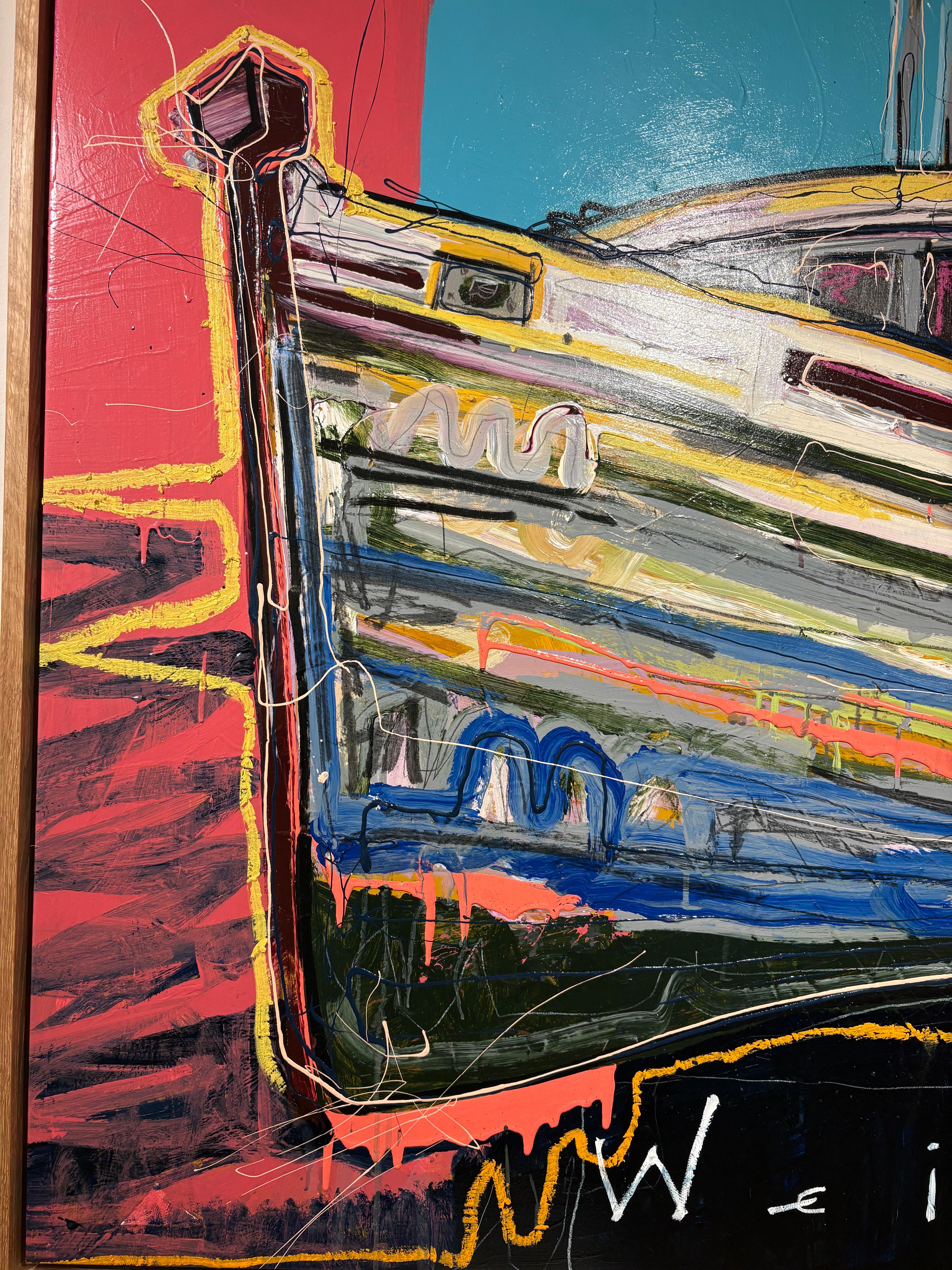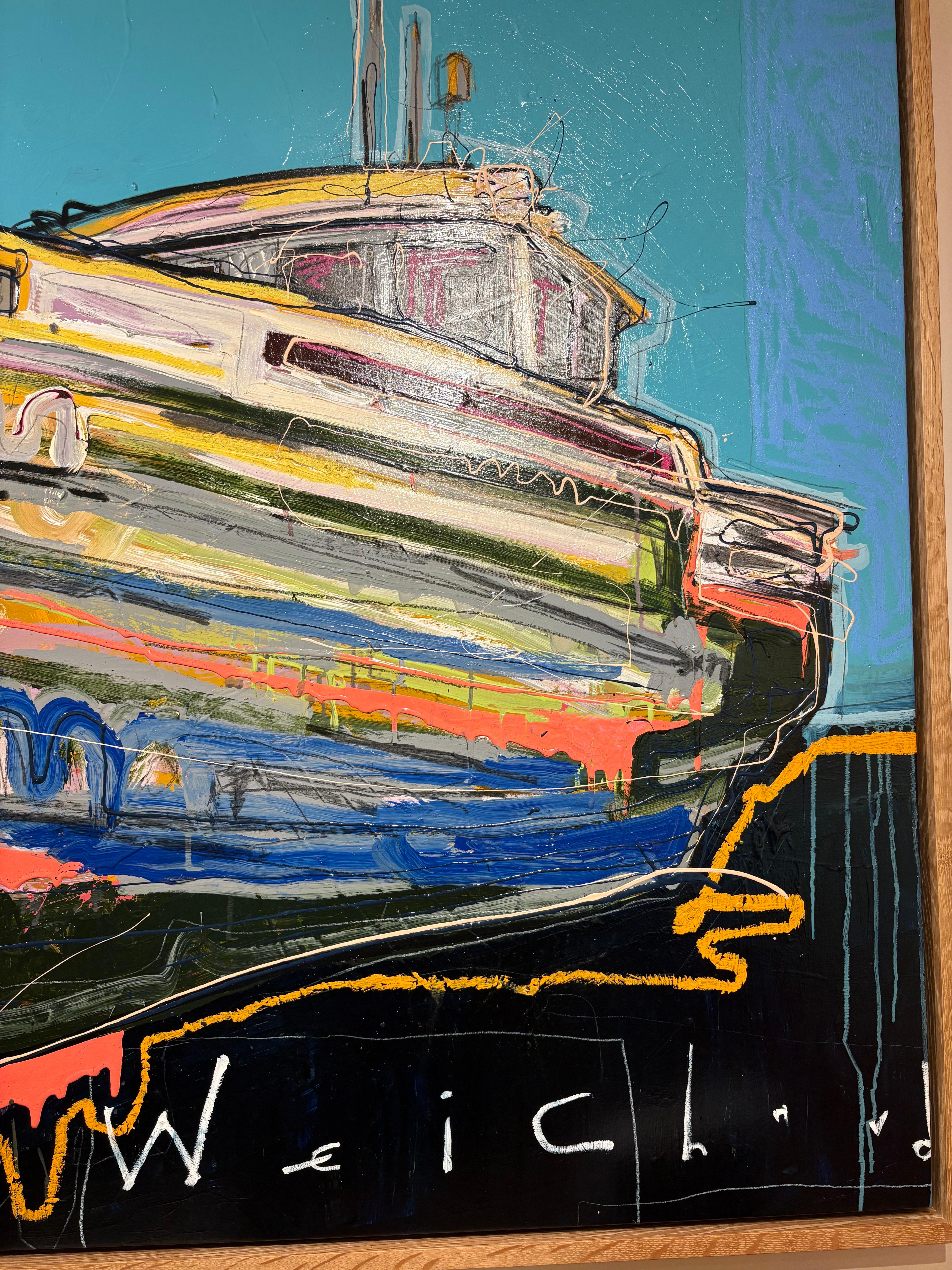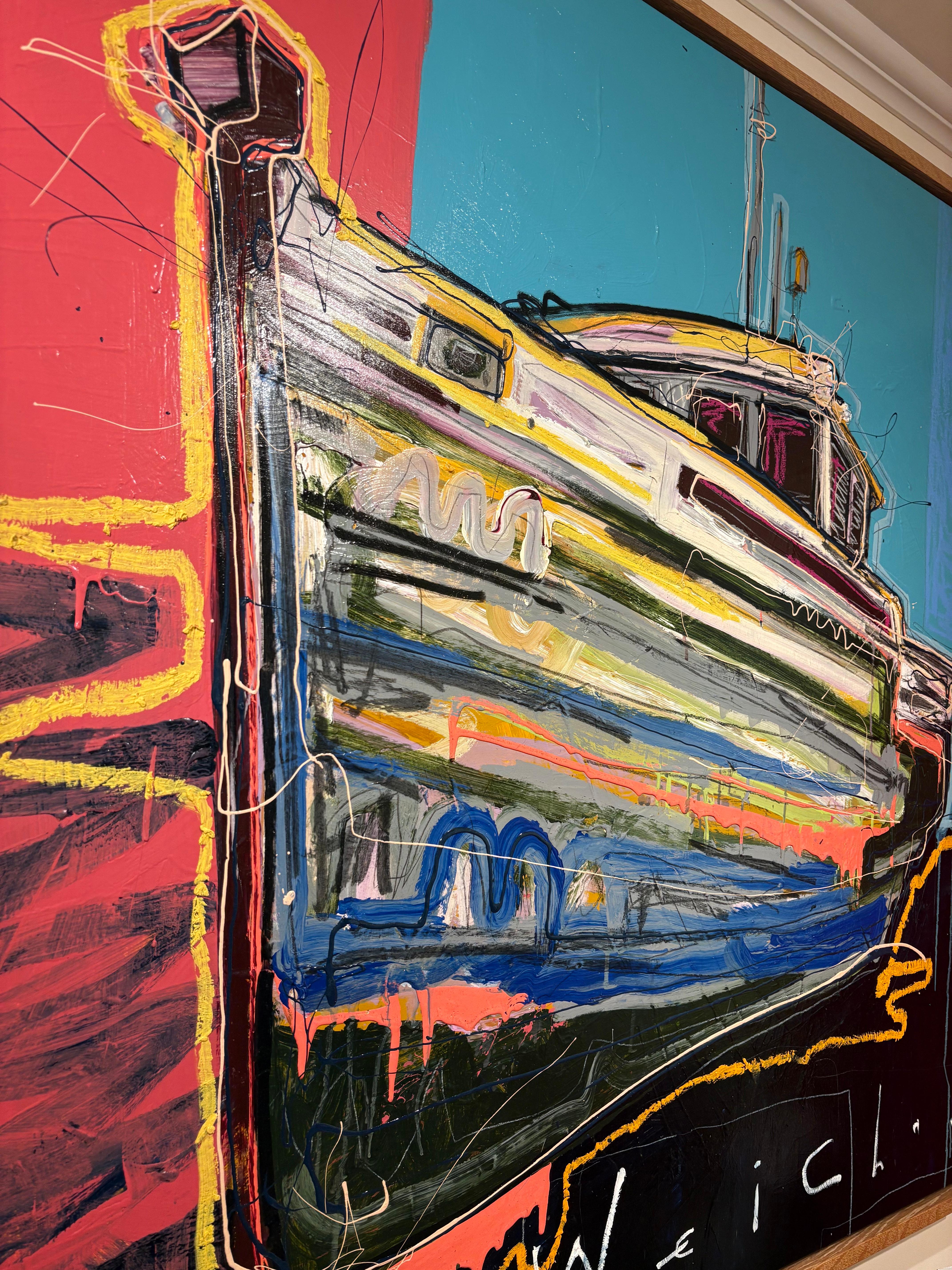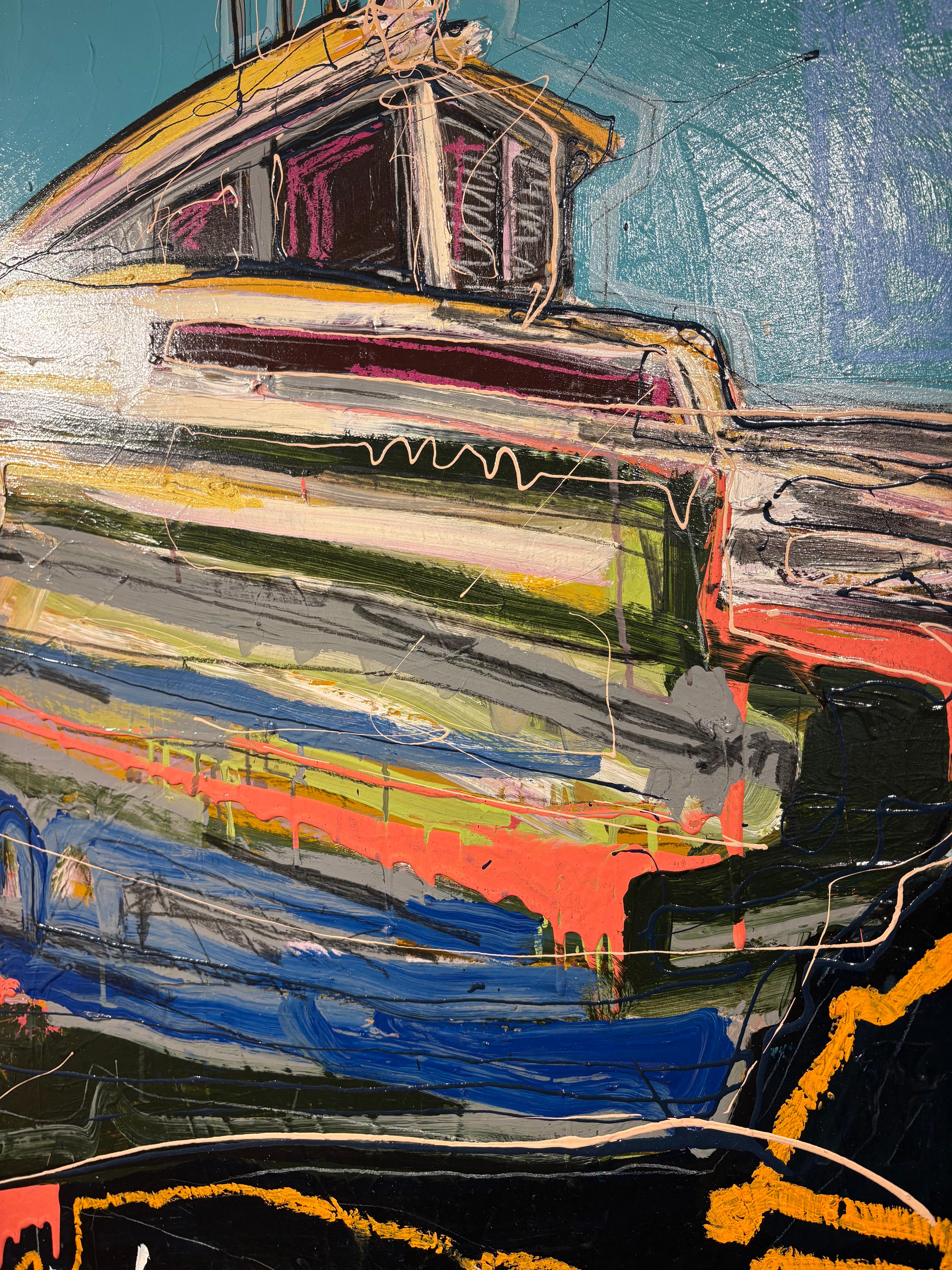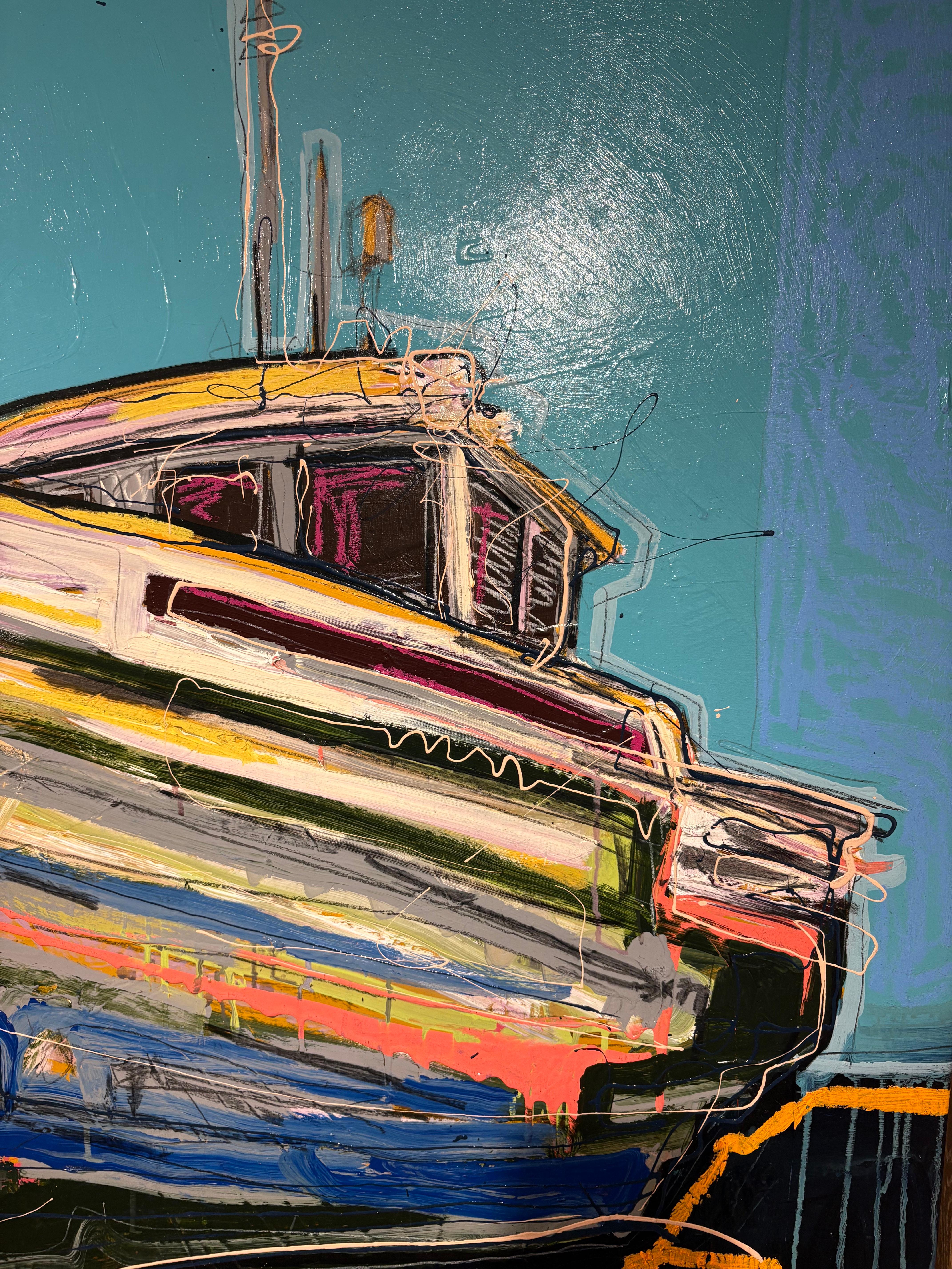 Aidan Weichard"Old Faithful" colorful abstract of the bow of a boat approaching shore2025