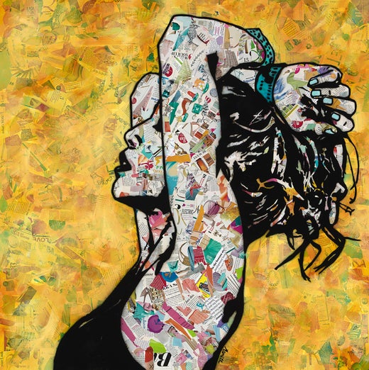 In her “Collage Portrait Series,” Smith uses photography, and layers of hand cut stencils, and torn recycled fashion magazine pieces to simultaneously represent her love of fashion and her contempt for excessive consumerism. In addition, she showcases female portraits to empower and unify, creating a space to feel connected to oneself and to each other.