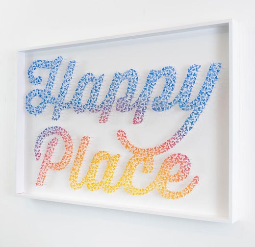 This piece is executed with hundreds of hand cut butterflies, and comes displayed in an acrylic shadow box. These works conjure sensations of nostalgia, created from maps, cutting out words, symbols, and places to create feelings of unity within the piece. Standing in juxtaposition with the contrast to clean, pixelated designs that the butterflies form, Laila creates a Heart that pops off the canvas in three-dimension. The artwork comes housed inside a plexiglass shadow box, ready to be displayed with hanging wire on verso.
