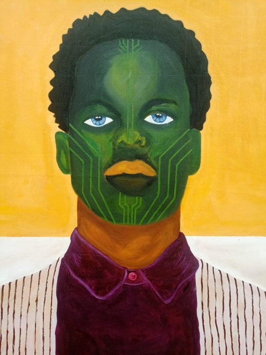 Born in Lagos (Nigeria) in 1994 and based in Abeokuta, Nigeria. Eniafe Gbenga Michael is a self-taught contemporary visual artist whose work has strong roots in soul-impersonating patterns, expressionism, and figurative realism. Eniafe Gbenga is a graduate of the Federal University of Agriculture, Abeokuta with a B.Agric degree in Animal Nutrition and Feed Technology. Eniafe started out with doing portraits before having a keen interest in body art and face painting using pattern representations of different lines where he later had the opportunity to work with a past political President, a State Governor, a special adviser of a state government, a TEDx event and a notable Bank; all in Nigeria while studying for a degree. With no formal education in visual art, Eniafe has mastered his craft to a reasonable extent with steady practice, on-field experience, and consistency. Drawing inspiration from his personal experiences and happenings in his society, Eniafe Gbenga's works are based mainly on storytelling, black identity evaluation, Power, and re-addressing racial opportunity sharing.