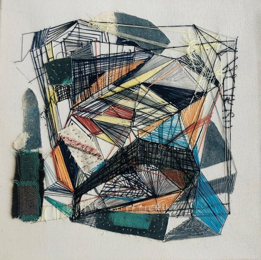 Wake, Stitched Sheer Textile Collage in Warm Earth Tones and Pastel Color Blocks