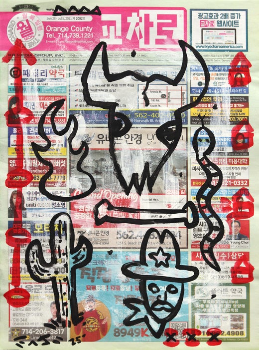 His street artworks have a whimsical yet exciting and bold quality, inspired by classic cartoon and comic book characters rendered with acrylic paint in a bold graffiti style, on newspaper, board or other media. His choice of newspapers reflects the diversity of his Los Angeles surroundings, including Korean language newspapers, which have become equally collected as his artworks on English language newspapers.