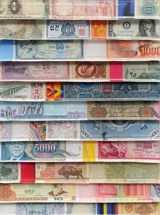 Medium: Mixed Media with Rare Currency and Resin on wood
