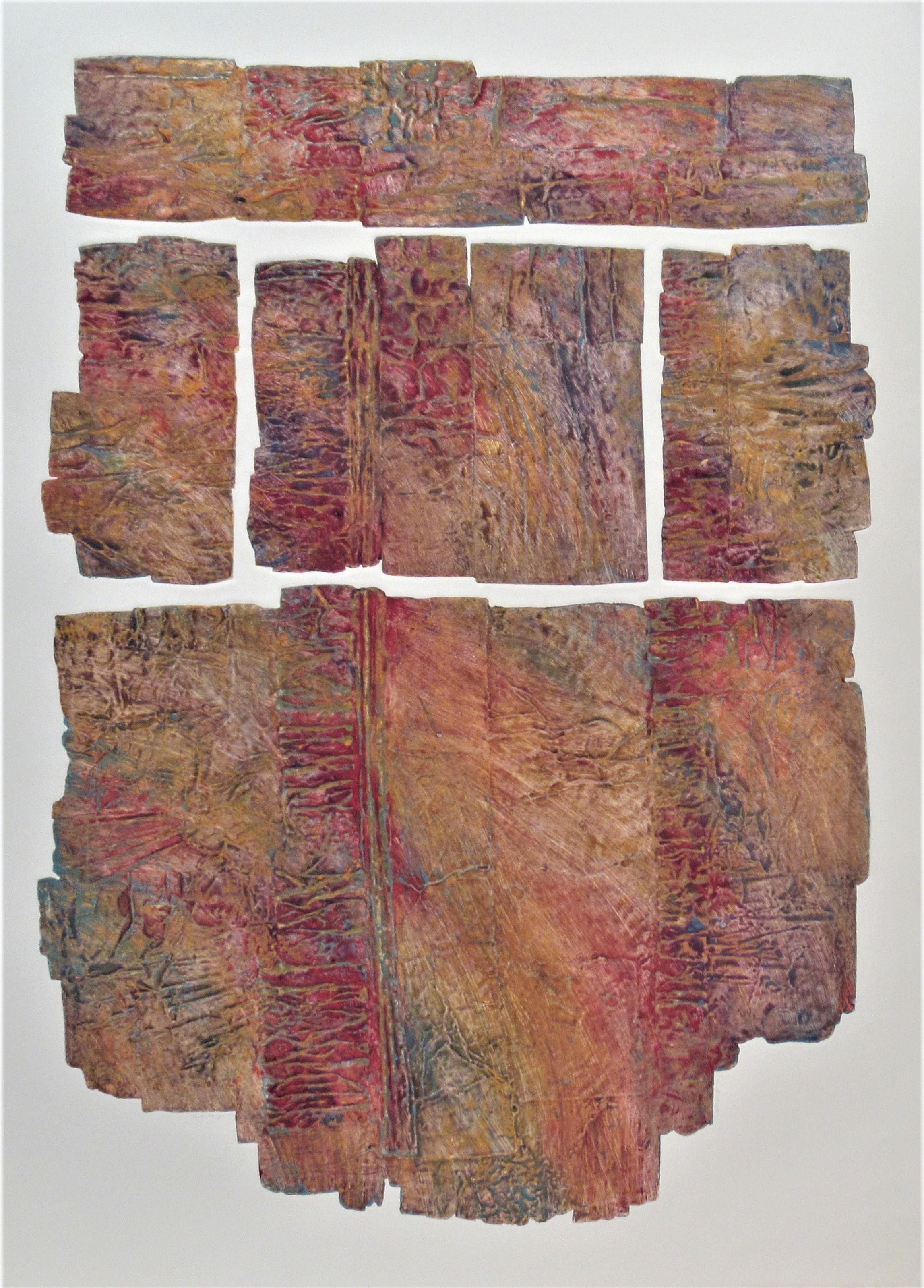 Hand-woven tapestry, shaped and in layers, in wool, linen, cotton, metallic, rayon. Based on paper collage.