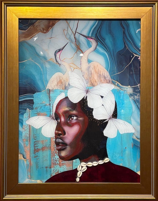 "African Diaspora" mixed media portrait of woman, gold headdress and graphic top