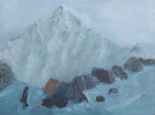 In “A life Attuned to Larger Rhythms” Houston grids out rectangles of captured images to overwhelm the eye as the polar environment itself might (whiteout is a paradoxical species of optical overstimulation). Through the strangely ordered confusion of an ice survey grafted atop a chessboard, the mind begins to recognize new connections, emergent shapes: a different future? In “Launching Strategy” a yellow-orange pyramid balances garishly atop a tent. Which came first, the realist tent or the Platonic shape? Can we ever be sure that we’re not already seeing through premade abstractions? Or is it that baggage we’ve been dragging along?