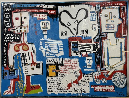 Jim Stella studied sculpture and anatomy at Pratt Institute in New York and graduated with high honors from the University of Michigan, which he atended on a medical illustration scholarship. He continued his education at the College for Creative Studies in Detroit, where he studied watercolor. He subsequently evolved from the realism inherent in his training to create what he has termed "rap art," combining words, colors and symbols to express his feelings and ideas about news and events, generally of an urban nature.