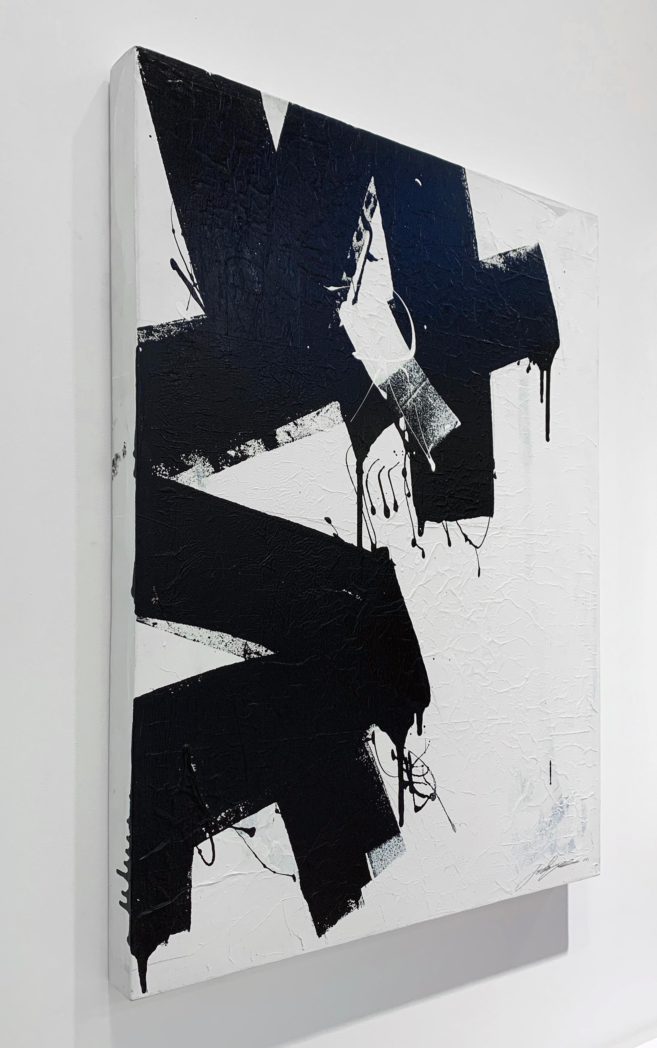 John Chang’s work is about childhood memory, cultural identity, and distance. “A Chinese student has to learn a few thousand words in order to write and read. I am also interested in black and white because black and white are not color, it’s about life and death, day and night, and negative and positive energy we have to deal with in our everyday life. In ways that transcend both the text and the medium to achieve a new level of awareness ‒ the higher consciousness that is also the goal of calligraphy. Because the characters function as visual elements rather than lexicography means, even the audience that can’t read Chinese can take part in the language of the module, the mark, the gesture, the performance, and the design. The ‘picture’ that results now reads like the as essential product of the effort to communicate across time/space/ culture, and not just a painterly allusion to it.”