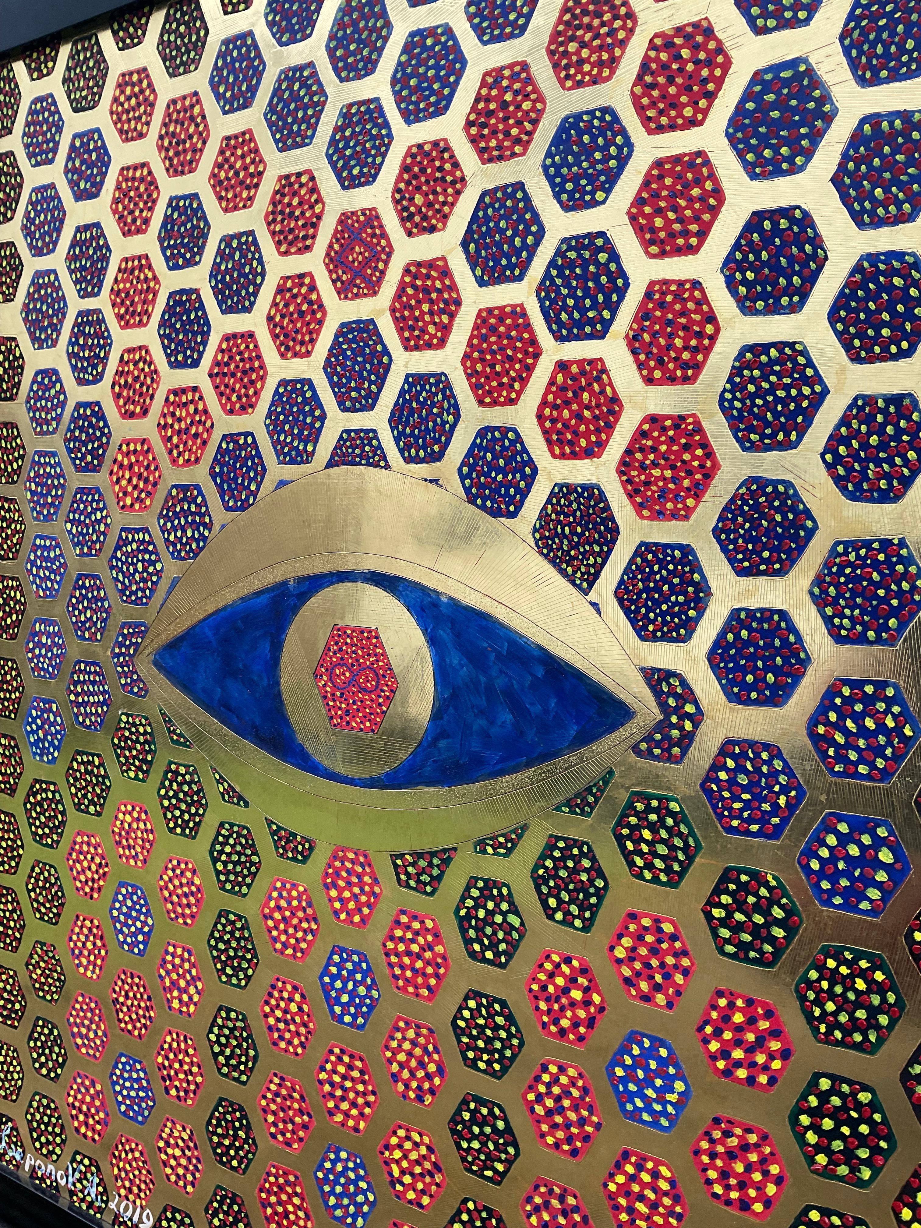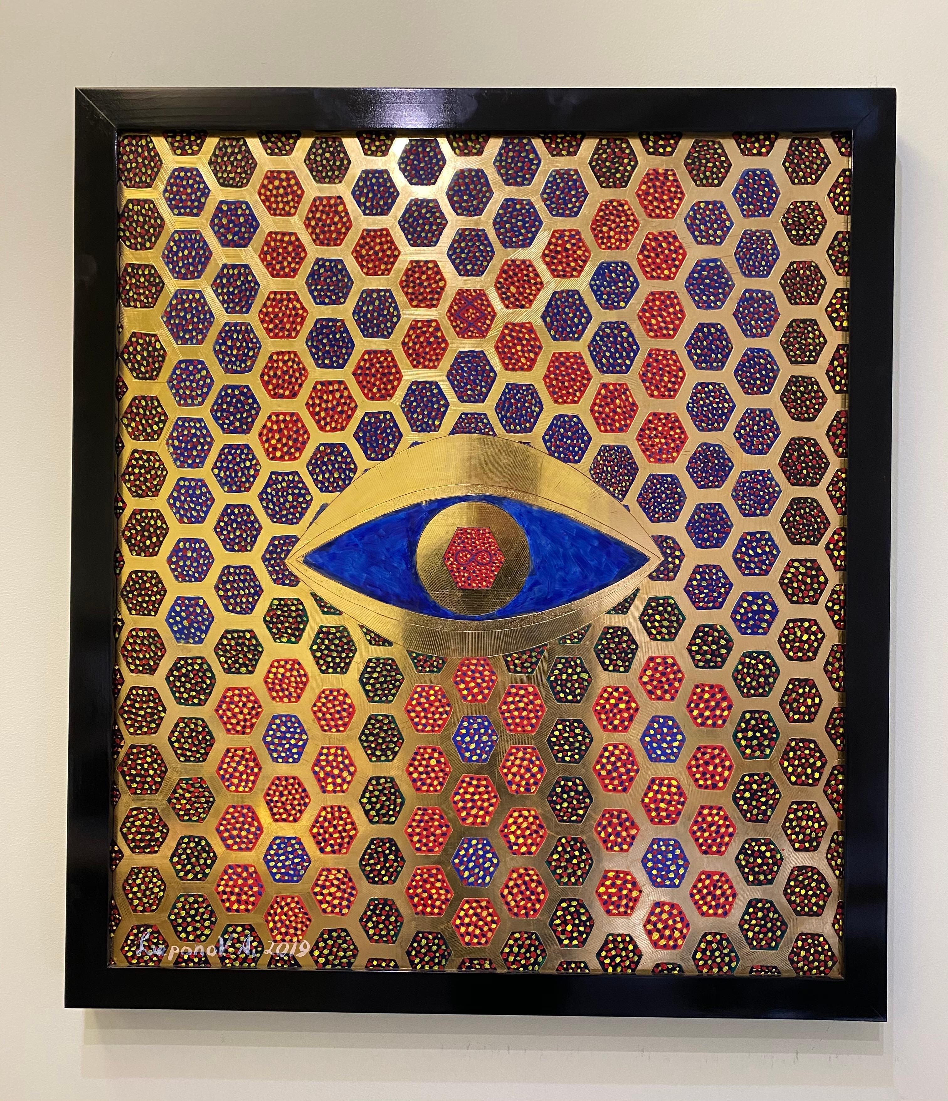 Here I depict the eye as a sign of inner vision — the capacity that perceives not outer forms but the deeper movement of the world. The hexagonal field around it serves as a model of infinity, a structure in which everything remains interconnected. The center, painted in ultramarine, stays as a living point of focus, while the golden rhythm around it creates a sense of spatial pulsation. This work speaks about the moment when consciousness opens and sees beyond the familiar.