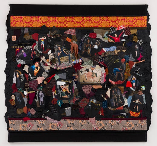 Linda Stein, Power Merged 804 - Feminist Mixed Media Fabric Leather Black Sculptural Tapestry