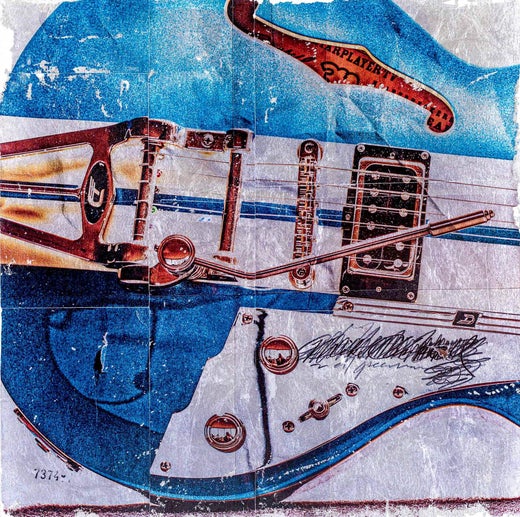 Color of Sound Series: 6 by Mark Jackson is a beautiful photograph of a blue electric guitar printed on silver and suspended on wood panel. The texture of the guitar body and string compliments the shiny texture of the silver creating a brilliant composition.