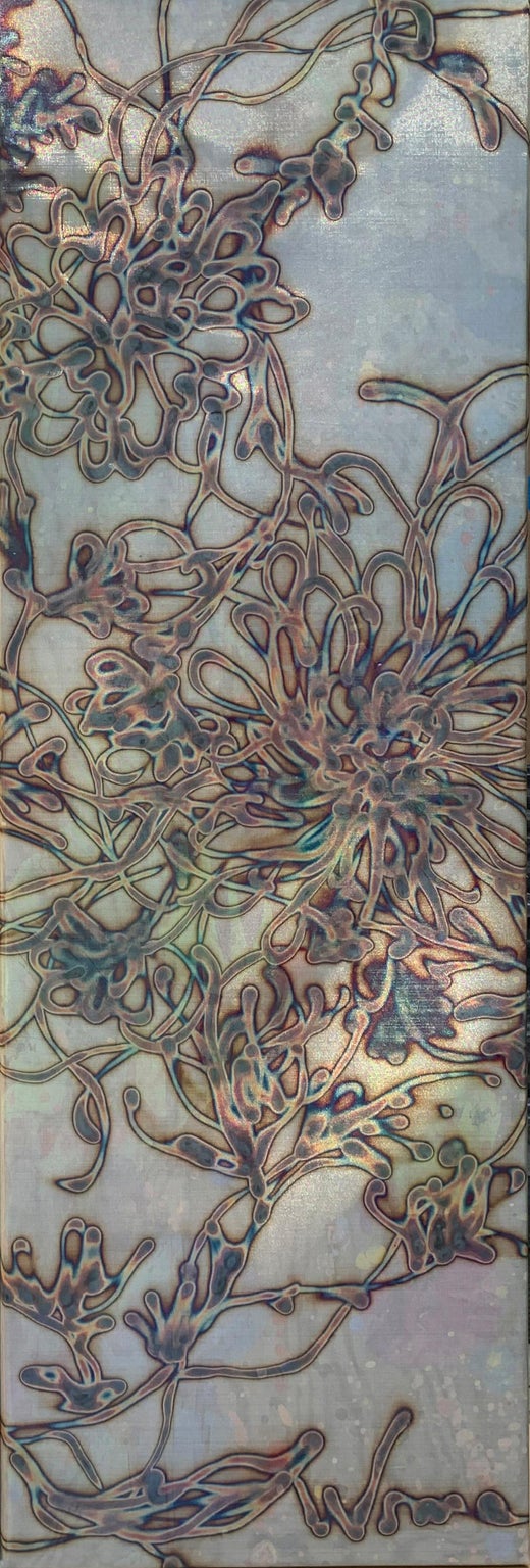Mirang Wonne is a prolific artist who uses innovative media and techniques. Her work is about the visual interpretation of the fragility of life. For the last two decades, Wonne has embodied natural forms in unexpected mediums. She uses primarily industrial materials that paradoxically amplify the organic intensity of those forms, capitalizing on their physical and optical peculiarities. Her work, in the words of Peter Frank, “forces us to marvel not just at what she’s done, but to marvel at nature itself—the nature not only of organic forms such as Wonne renders but of inorganic substances such as she manipulates in her rendering.” The images are spiritual, “both in the sense of something metaphysical and in the sense of some presence made of ghostly plasma.” In her recent screen work, Wonne “draws” on fine stainless steel mesh with a blowtorch. By transforming a material more associated with industry than with art, Wonne achieves results that are unpredictably subtle and intimate, as alluring as gemstones and as transcendent as thoughts.
