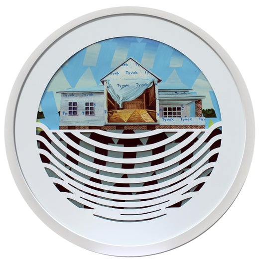 In his most recent series the American home (stability) and fragmented and shifting landscape (instability) are veiled by a digitally produced mat. Traditionally a mat is, by definition, a flat, thin piece of paper based material included within the picture frame and serves as additional decoration when framing artwork. He activates this commonly overlooked material by using a non-traditional material, Sintra (flattened sheet of PVC), that has a negative digitally drawn image cut-out. This cut-out might, at first glance, look hand cut however, a more astute viewer would realize the precision is mechanical. The mat has been transformed from inactive decoration to digitally produced veil that represents the technologically anxious precision we surround ourselves with.