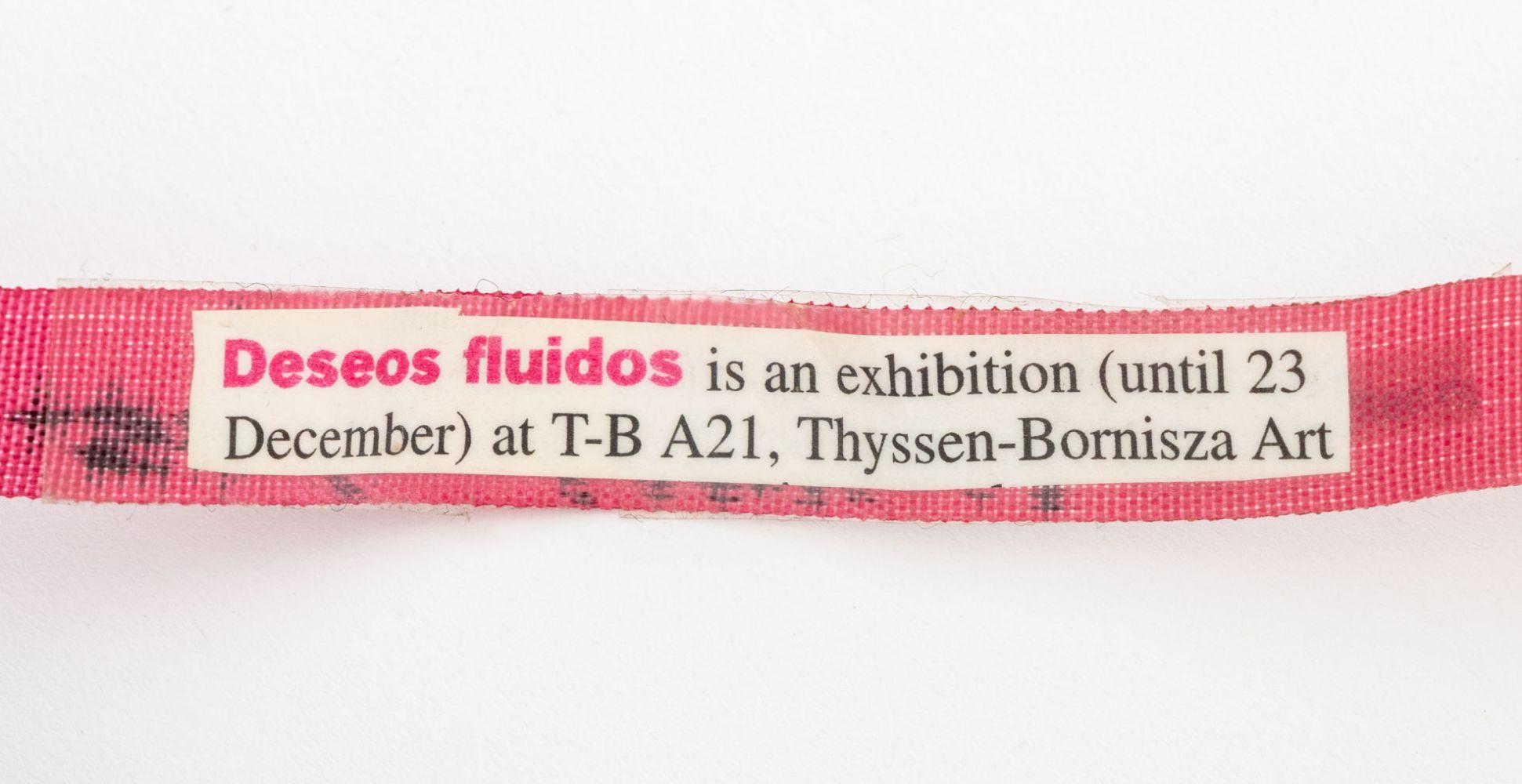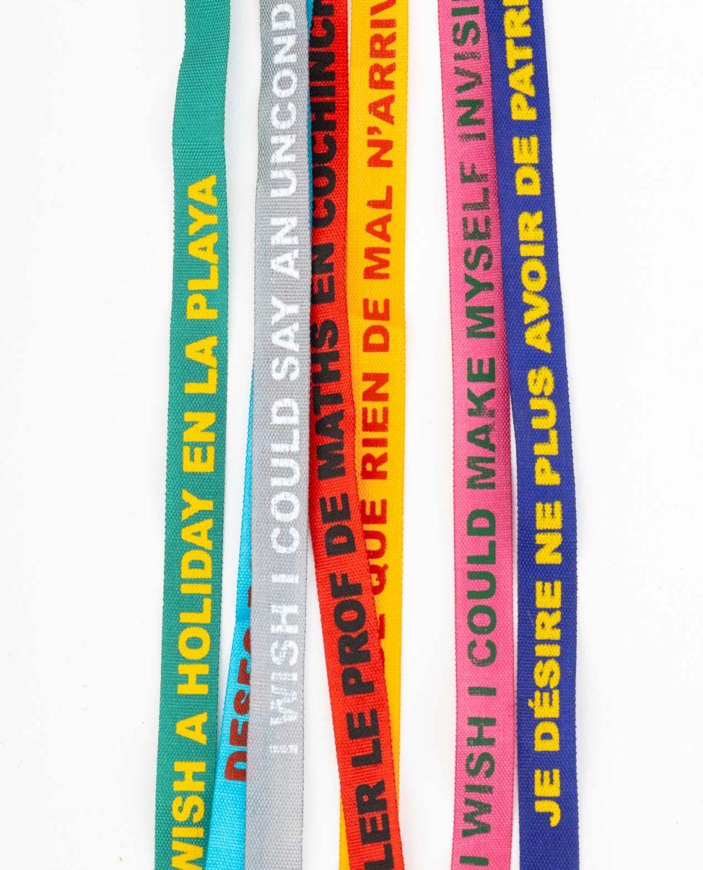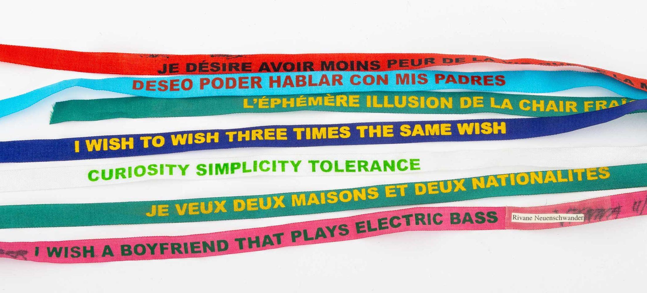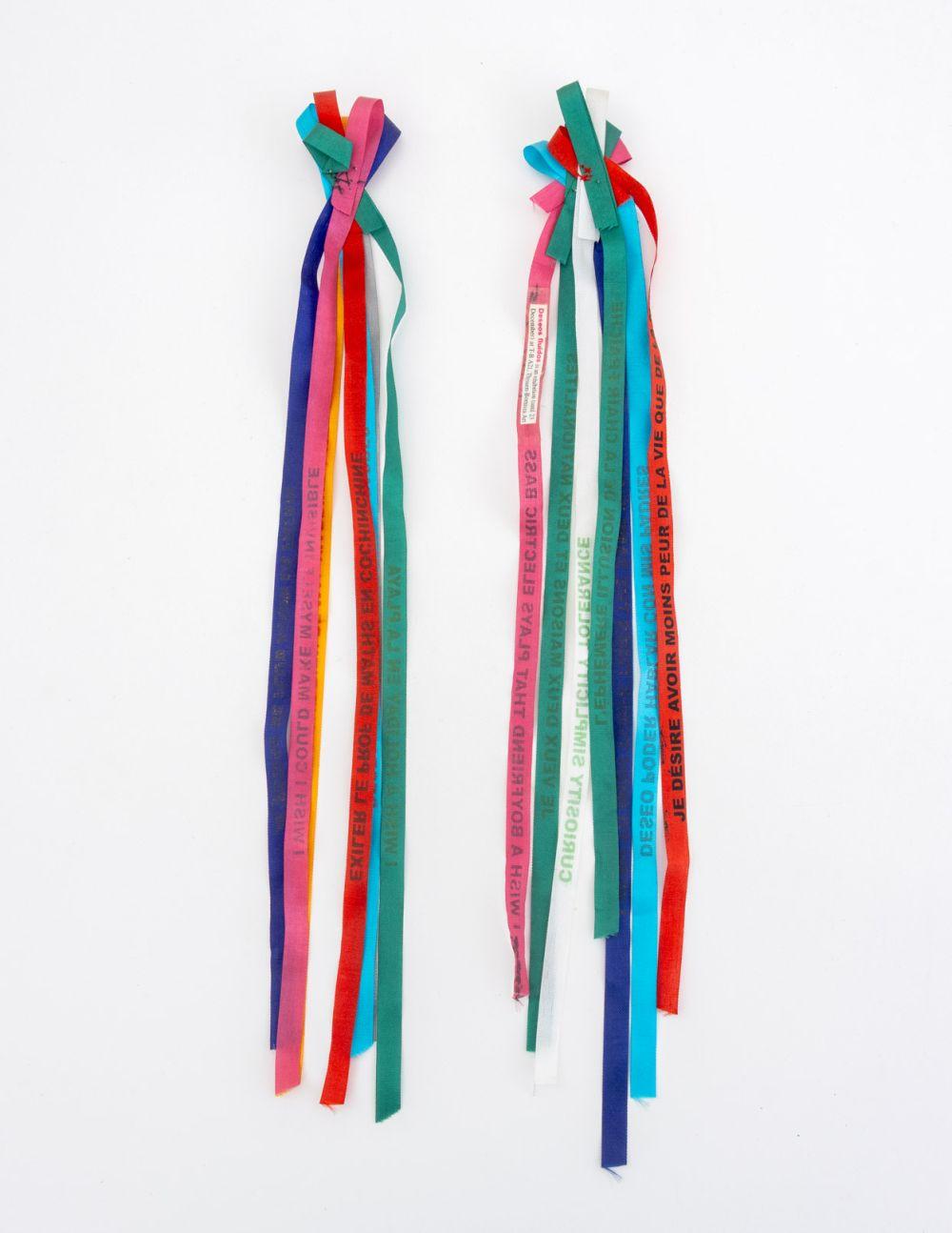 Rivane Neuenschwander (Brazilian, b. 1967), "Eu Desejo O Seu Desejo" [I Wish Your Wish], Colored Textile Ribbons, 2003, two stapled bunches printed with people's wishes, one signed with "Rivane Neuenschwander" and "Deseos fluidos is an exhibition (until 23 December) at T-B A21, Thyssen-Bornisza Art" labels.