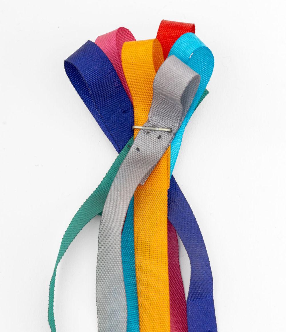 Linen yarn, textile stripe, stainless steel hanger; size of the textile: 155 x 64 cm (128 cm circuit),