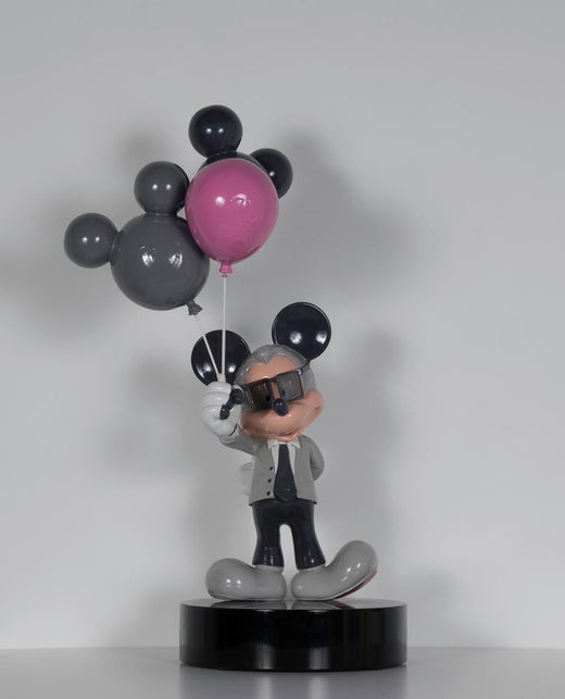 "Mickey Lagerfeld Package (White)" acrylic on canvas painting by artist Skyler Grey inside a polystyrene toy package case. Canvas is signed Skyler Grey © 20. Depicts Mickey Mouse as ...
