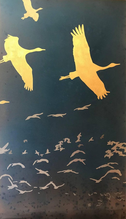 Drawing on these first-hand experiences, he depicts the cranes through a host of media and techniques. He uses materials ranging from gold leaf, silver and pewter to oxidized copper, palladium and gouache. The gilding allows his paintings to change according to the light.